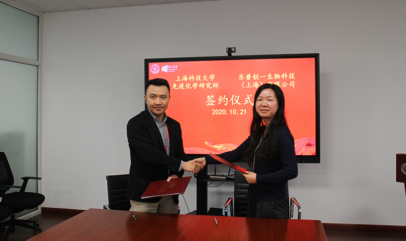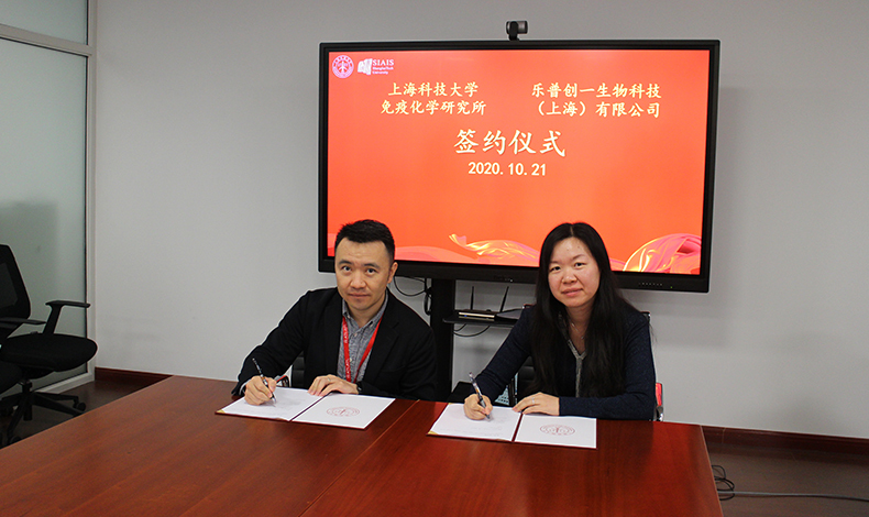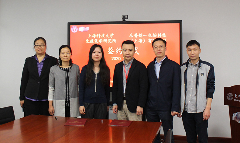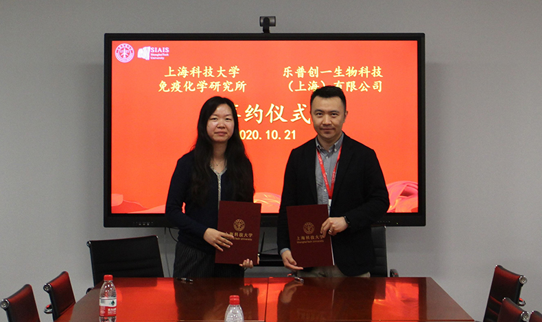 2020年10月21日,上海科技大學免疫化學研究所與樂普創一生物科技(上海)有限公司舉行科研合作簽約儀式。上海科技大學免疫化學研究所助理所長、高通量篩選平臺主任雷穎,上海科技大學免疫化學研究所高通量篩選平臺工程師孔娟,上海科技大學免疫化學研究所高通量篩選平臺工程師姜連連,樂普創一生物科技(上海)有限公司總經理方磊,樂普創一生物科技(上海)有限公司抗體平臺主任曲志虎,樂普創一生物科技(上海)有限公司科學家王旭輝等出席簽約儀式。