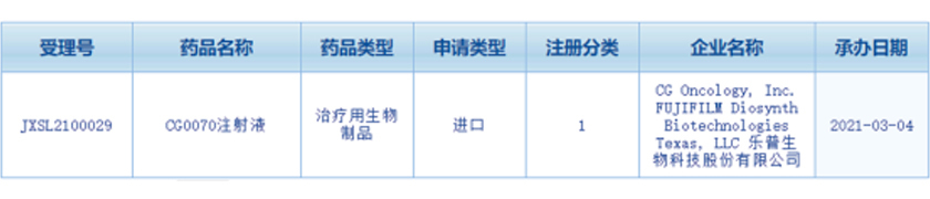 樂普生物科技股份有限公司(以下簡稱“樂普生物”)“CG0070注射液”臨床試驗申請已獲國家藥監局藥品審評中心(CDE)受理(受理號:JXSL2100029),并于2021年3月4日公示。